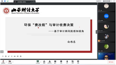 之后,白玮东博士分享了工作论文《环保“费改税”与审计收费决策——基于审计师风险感知视角》。三位点评老师分别提出详实的修改建议。王晓亮老师指出:环保“费改税”如何会计披露及时性应加强阐述,逻辑推理不严谨;文章稳健性检验剔除2014-2015年样本,是否合理需要进一步考虑;异质性分析部分分析事务所规模、任期等如何影响审计收费,并没有说明其与环保“费改税”、审计收费三者之间关系。郭檬楠老师指出:题目中的审计收费决策,是审计决策还是审计收费,界定不清晰;对于环保“费改税”实施的衡量方法值得商榷。林嘉安老师指出:文章为何剔除金融行业需在文中说明;平行趋势检验结果不具有说服力,建议进一步完善。袁春生老师作为指导老师对大家提出的修改意见表示感谢,并希望白玮东在听取老师们的意见之后继续完善论文。