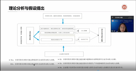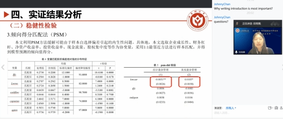 博士生高蕾同学汇报了题为《数字化转型、非国有股东参股与国企劳动收入份额》的工作论文。贺亚楠老师指出:引言部分以及论文布局并未能很好对照题目的数字化转型;论文对于劳动收入份额降低的定位不准确;企业数字化调节作用的正负方向不明确。郭檬楠老师指出:从题目来看,数字化转型应是本文研究的一个关键变量但在后文的实证检验中却放在了拓展性分析中,并未体现出其重要性;异质性检验建议增加对研究结论的解释说明;政策建议较为单薄,建议跟共同富裕、国企混改、数字经济发展等联系起来,丰富研究结论的实践指导意义。CHAN教授指出非国有股东参股涉及公司管制、代理问题等,可以和劳动收入份额进行结合;文章研究内容丰富选题新颖,预祝文章早日发表。