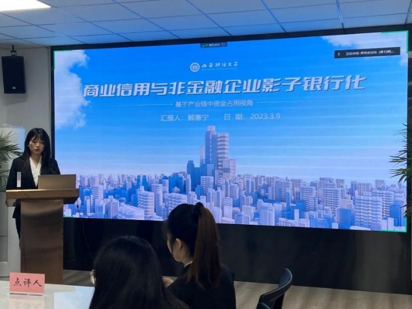 硕士生解蕙宁汇报了工作论文《商业信用与非金融企业影子银行化——基于产业链中资金占用视角》。李林波老师认为:文章在阐述商业信用如何影响影子银行化时缺乏典型事实和必要阐述,理论分析要从“可能性”向“必要性”转变,而且对本文的商业信用测度方式和工具变量的选取提出了改进意见。王婉婷老师认为,影子银行业务复杂多样,应该对本文的影子银行活动做出界定,还提出本文在理论分析时存在主题偏移、前后矛盾的问题,应当予以注意,进一步地,王婉婷老师对本文的控制变量、模型设计以及异质性分析提出了一些修改建议。