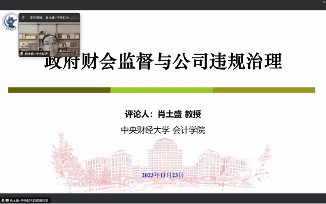 博士研究生白玮东汇报了自己的工作论文,题目为《政府会计监督与企业违规》。肖土盛教授、王帆教授进行点评。
