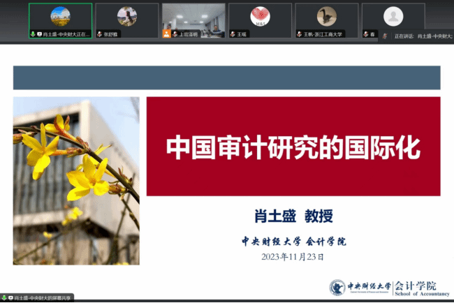 肖土盛教授做了题为《中国审计研究的国际化》的主题讲座。首先,肖土盛教授说明了国际、国内审计研究的具体情况和相关数据;其次肖土盛教授详细介绍了其在审计领域的一些探索,分析了《审计师个体经历将如何塑造其职业谨慎性》《审计知识分享将如何影响审计质量》《审计师的眼界经历将如何影响其审计决策》三篇报告;接下来肖土盛教授讲到如何评估一个研究,主要从研究问题、文献积累及研究检验三方面说明;最后肖土盛教授进行小结,建议我们要提出有新意有潜力的问题、多与优秀的学者合作、耐心坚持不断超越自己、讲好中国故事。