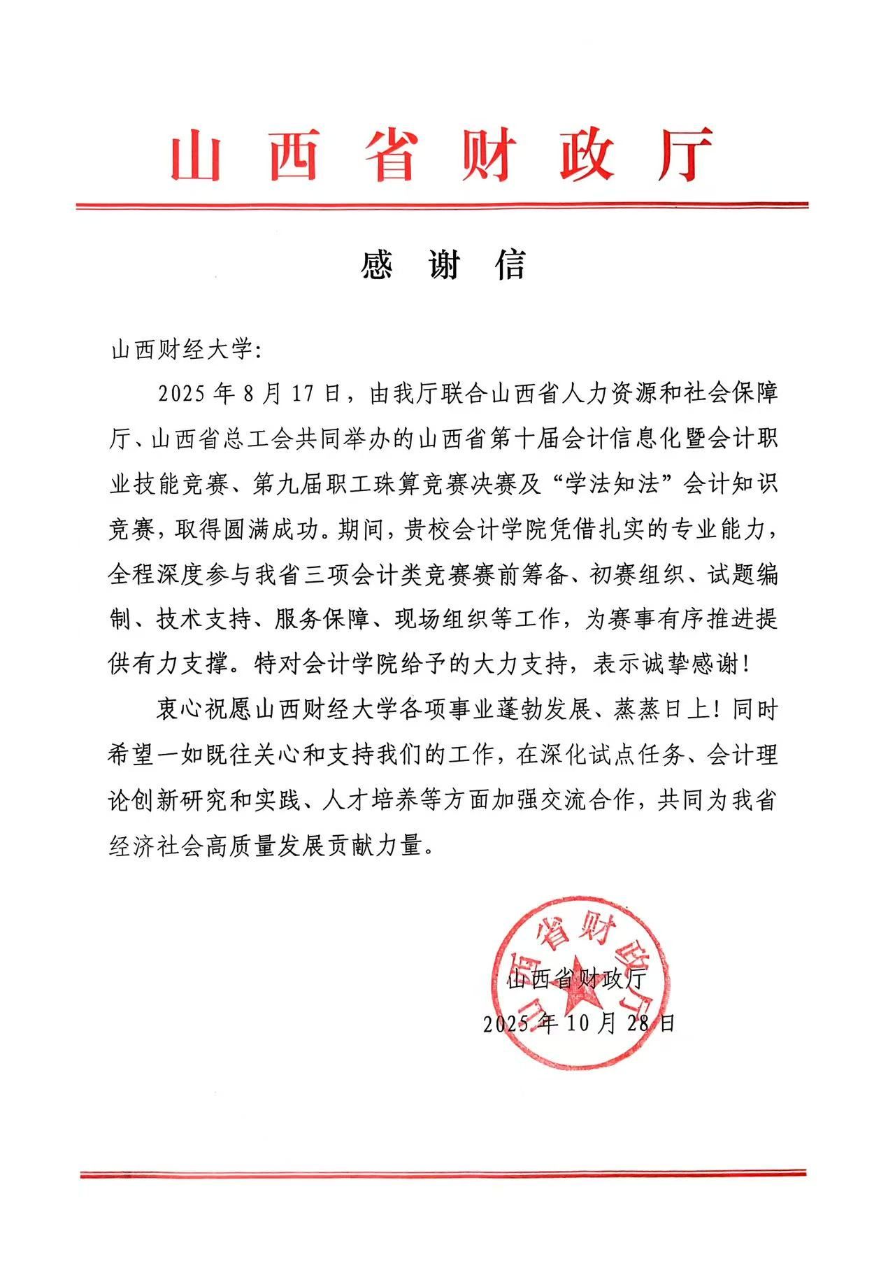 山西省财政厅致信致谢我校鼎力支持三项会计赛事