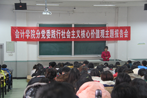 1216下午,单机麻将在线 分党委在坞城校区SJ14教室开展了“践行社会主义核心价值观”主题活动第二场报告会,邀请安建香同志做了以“爱岗敬业——我的社会主义核心价值观”为主题的专场报告。单机麻将在线 全体领导、辅导员、教师、学生党员和学生干部参加了本次活动。