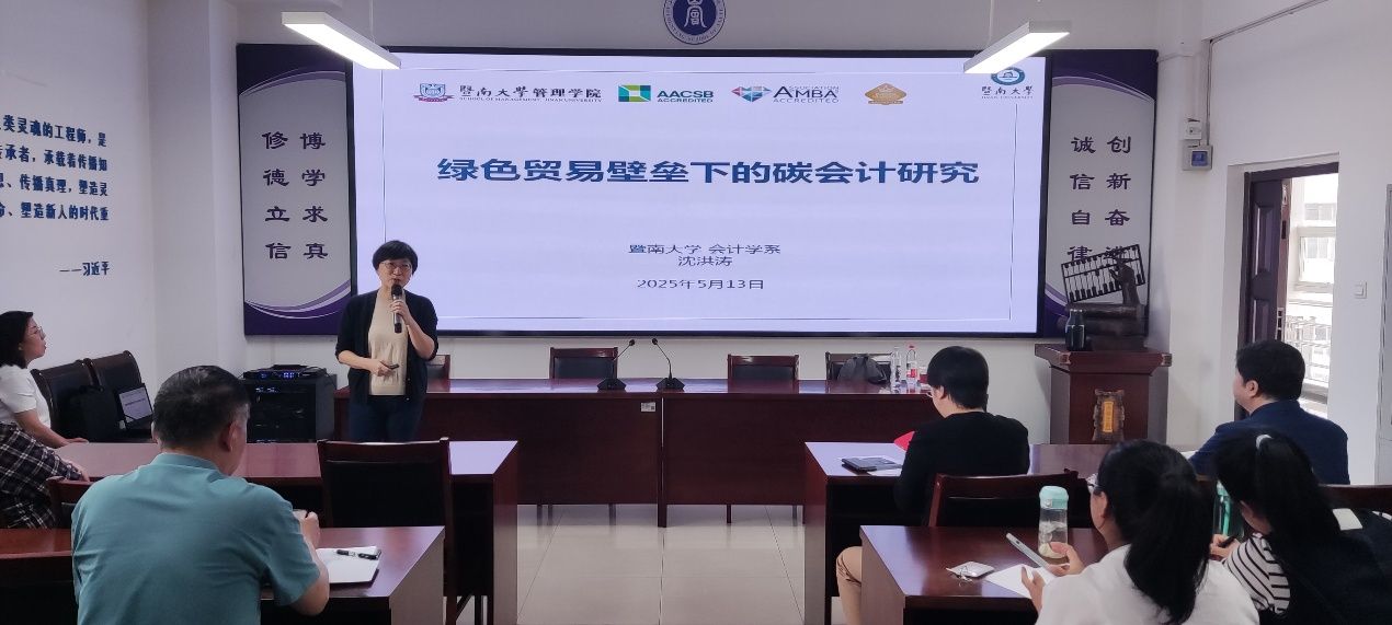 骨干教师及博、硕士研究生做专题报告,先后讲解了“绿色贸易壁垒的背景”、“碳成本核算”、“产品碳足迹核算”、“搁浅资产”四方面的内容。报告围绕全球绿色贸易新格局下的会计学科发展,从理论前沿与实践应用双重维度展开深度剖析。沈教授首先解读了欧盟碳边境调节机制(CBAM)等国际贸易新规对中国企业的深远影响,继而系统阐释了碳成本核算体系、产品全生命周期碳足迹、搁浅资产等关键议题。并通过航运业典型案例分析,生动展现了碳会计在企业战略决策中的实践价值。
