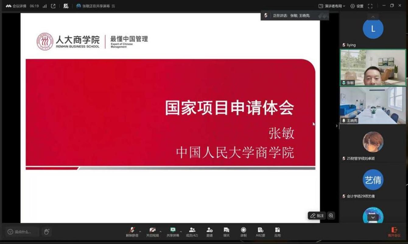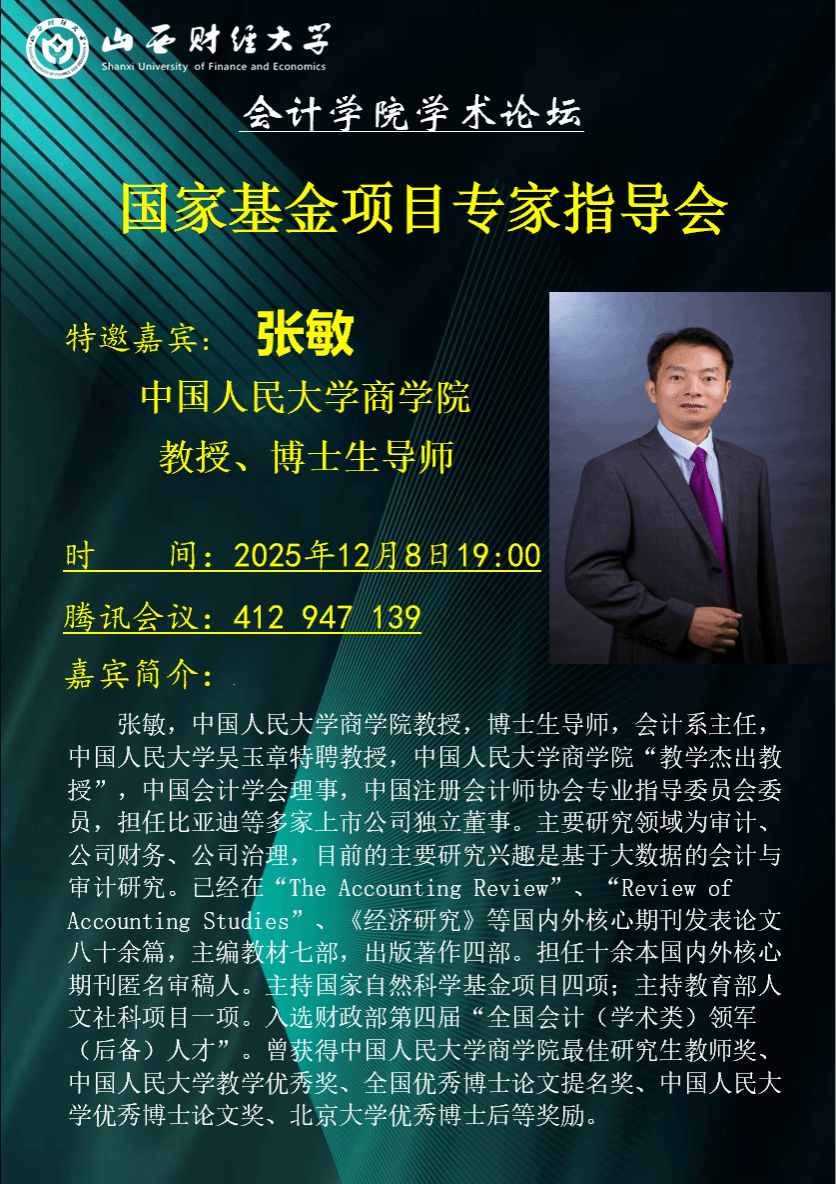2025年12月8日晚19:00,会计学院学术论坛第207期如期举行。本期论坛特邀中国人民大学商学院张敏教授担任主讲嘉宾,为学院师生带来一场题为“国家项目申请体会”的学术报告,并进行国家级项目申报专题辅导。论坛由我院王晓亮教授主持,李颖副院长、学院青年科研骨干教师及硕博研究生共计100余人齐聚一堂,围绕国家级科研项目申报这一主题展开了深入的学习与交流。